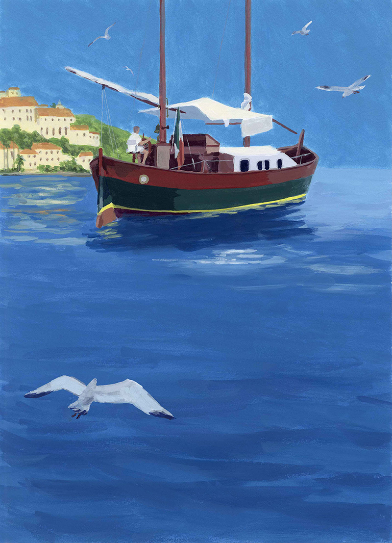 表紙のイラストレーションは、木造帆船が港から沖へ出てゆく場面をイメージして描いたもの。