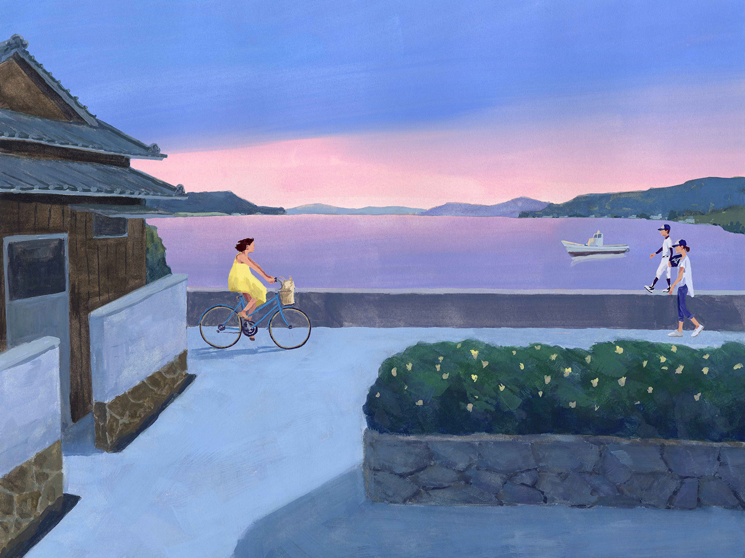 島の風景と主人公がスナックへ向かう場面を描いています。