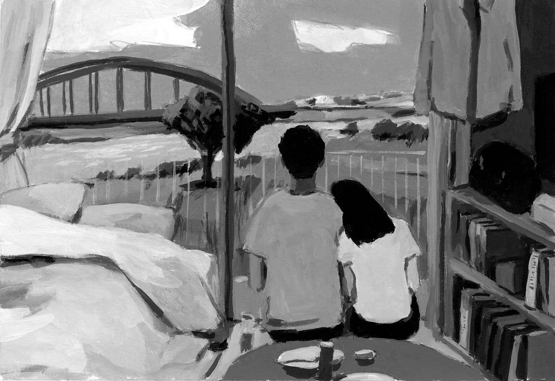 小説新潮掲載の読み切り『多摩川に住んでた。』(逢崎遊 著)の挿絵。