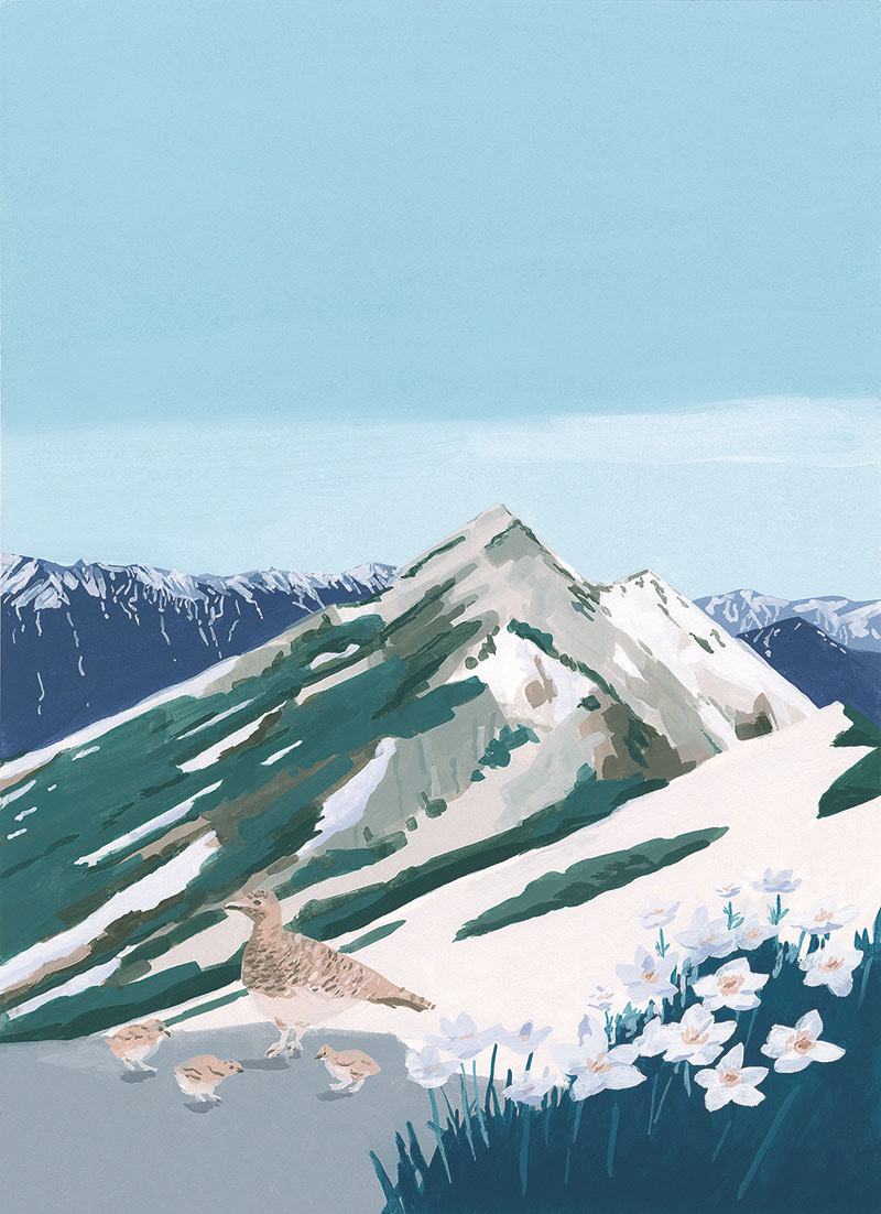 登山情報誌『山と渓谷』2019年1月号の付録『山の便利帳』のカバーイラストレーション。燕岳を背景に雷鳥親子を描いています。デザインは細山田デザイン事務所。
