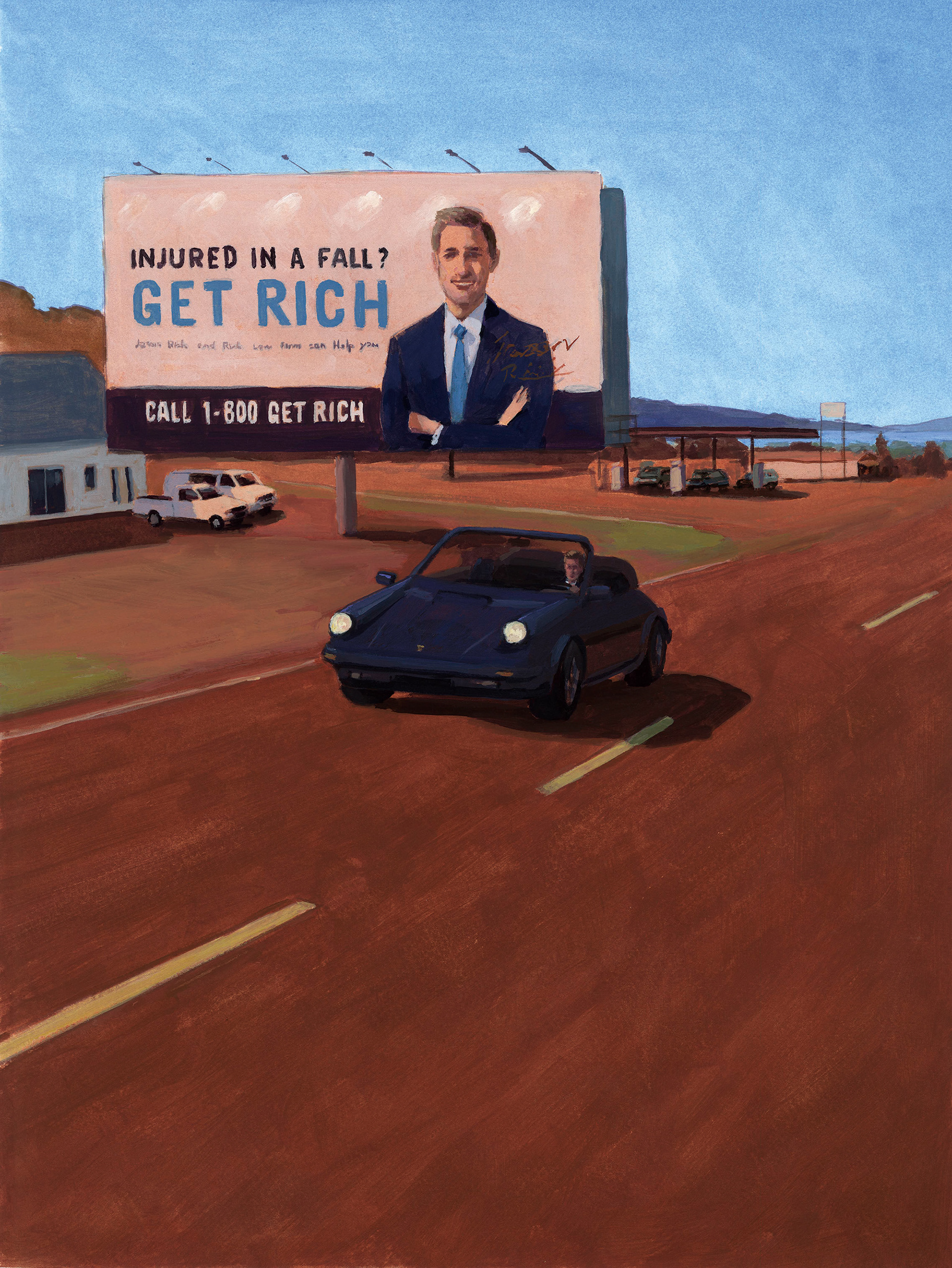 小説『リッチ・ブラッド』(ロバート・ベイリー 著)のための装画。物語の舞台であるアメリカ・アラバマ州の風景と、主人公のビルボード広告、愛車のポルシェを描いております。